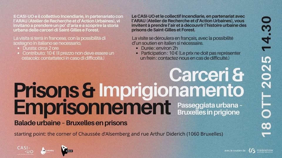 Le CASI-UO et le collectif Incendiarie, en partenariat avec l’ARAU (Atelier de Recherche et d’Action Urbaines), vous invitent à prendre l’air et à découvrir l’histoire urbaine des prisons de Saint-Gilles et Forest.
