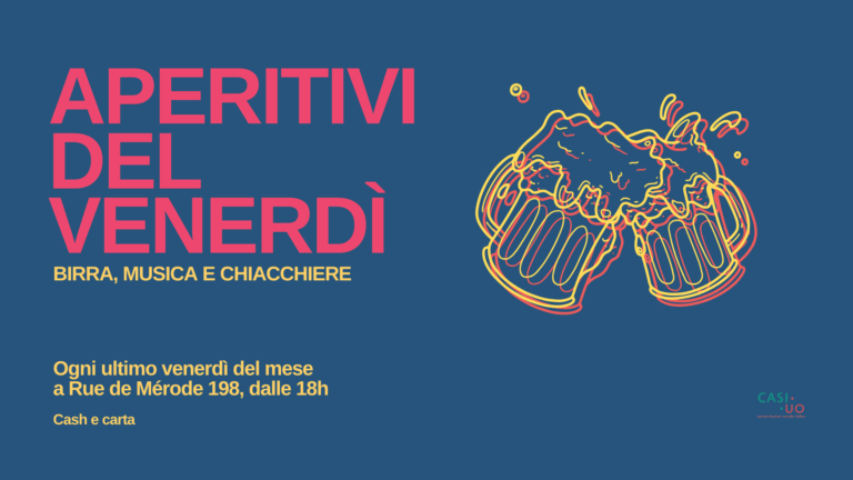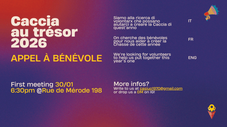 Ogni ultimo venerdì del mese, dalle 18:00 alle 22:00, vi aspettiamo in rue Mérode 198 (Saint-Gilles), nel locale condiviso da CASI e Incendiarie. Per questo venerdì è previsto il primo incontro per parlare collettivamente della Caccia al tesoro 2026! Ne vuoi sapere di più? Scrivici al o leggi l’evento FB: https://fb.me/e/44Q9aJLAS