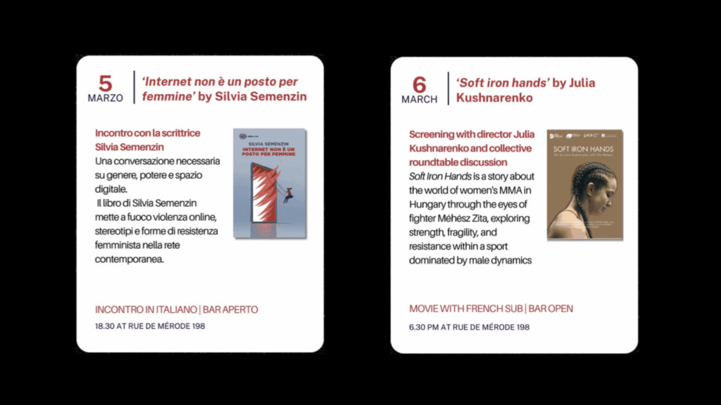 In collaboration with CASI, we will gather for the presentation in Italian of the book Internet non è un posto per femmine by Silvia Semenzin (5/03 at 6:30 PM, Rue de Mérode 198) and for the screening of the short film Soft Iron Hands by Julia Kushnarenko (6/03 at 6:30 PM, Rue de Mérode 198, film with French subtitles).