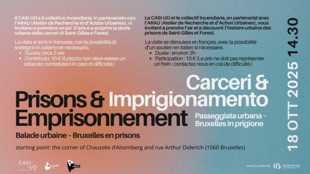 Balade urbaine – Bruxelles en prisons Le CASI-UO et le collectif Incendiarie, en partenariat avec l’ARAU (Atelier de Recherche et d’Action Urbaines), vous invitent à prendre l’air et à découvrir l’histoire urbaine des prisons de Saint-Gilles et Forest. Au fil de la balade, nous aborderons :la conception du modèle panoptique,le développement urbain des communes,les débats autour des réaffectations et reconversions possibles. La visite se déroulera en français, avec la possibilité d’un soutien en italien si nécessaire. Durée : environ 2h Participation : 10 €Le prix ne doit pas représenter un frein : contactez-nous en cas de difficulté. Info & réservations: le soutien de la Fédération Wallonie Bruxelles Lien FB