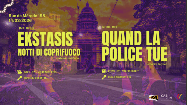 Projections-débats des films Ekstasis et Quand la police tue en présence des réalisateur.trice (IT)Notti sospese. Violenza di Stato. Due sguardi, una sola domanda: che cosa ci fa il potere sui corpi?Il Cine-club del CASI-UO, il Collectif24, vi invita sabato 14 marzo a un pomeriggio di cinema documentario e dibattito, nel quadro di À Films Ouverts:🎬 Ekstasis – notti di coprifuoco di Alessio del Donno, Bologna, 2021. Le strade vuote, i giovani che resistono, la notte come spazio sottratto e ritrovato. Proiezione ore 15h — dibattito con il regista ore 16h. 🎬 Quand la police tue di Cécile Guypen Quattro famiglie belghe. Quattro lutti. Una violenza che lo Stato fatica a nominare. Proiezione ore 17h30 — dibattito con entrambi i registi ore 18h30 📅 Sabato 14 marzo 2026 🕗 Ekstasis: 15h-16h🕗 Quand la police tue: 17h30-18h30📌 Locale del CASI-UO e di Incendiarie, Rue de Mérode 198, 1060 Saint-Gilles 💬 Dibattiti tradotti in FR e…
