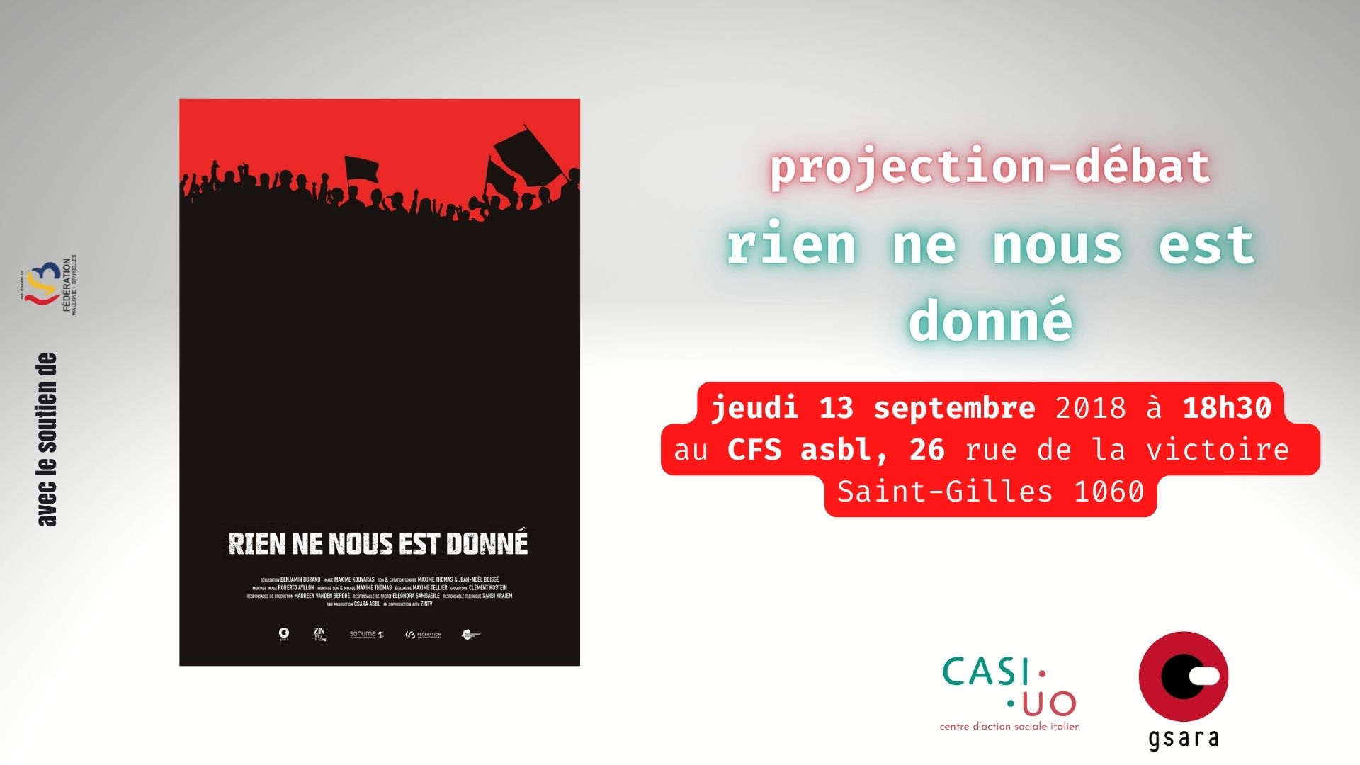 La première projection de l’année 2019 a coïncidé avec la dernière du cycle sur le travail commencé en 2018. Le cycle des projections-débats sur le travail a commencé en 2018 et il a été clôturé en 2019. Cette programmation a eu comme fil conducteur le travail et les luttes dans le monde du travail. Nous avons choisi cette thématique parce que le travail est au cœur de nos existences et que, trop souvent, les décisions importantes n’y sont pas prises par les travailleurs, qui sont pourtant les premiers concernés. En Europe, pendant les 30 années qui ont suivi la Deuxième guerre mondiale, les travailleurs ont pu partiellement imposer leur voix, grâce à leur force : chaque droit social a été une conquête. Depuis 40 ans, ces victoires n’ont cessé d’être remises en cause par le néolibéralisme. Non content de s’attaquer aux organisations des travailleurs et à la grève, le discours dominant nous raconte qu’il n’y a plus des classes, ni d’antagonismes de classe. Il n’y aurait plus d’ouvriers, si ce n’est dans les pays étrangers : en Occident l’existence même des travailleurs et de leurs intérêts spécifiques sont niés. Malgré ces efforts menés par les classes dominantes pour voiler la réalité du terrain, les faits sont autres et les travailleurs sont loin d’accepter d’être transformés en objets ou marchandises. Pour cela la lutte continue : pour le salaire, pour le temps, pour les conditions de travail, pour la vie et l’existence. Avec ce cycle, clôturé en février 2019, nous avons voulu contribuer à cette lutte en stimulant des réflexions afin de faciliter la rencontre, la reconnaissance réciproque et l’organisation.