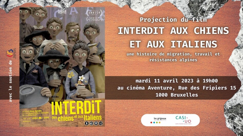 projection-débaT « INTERDIT AUX CHIENS ET AUX ITALIENS » Projection du film « Interdit aux chiens et aux Italiens » Projection-débat de « Interdit aux chiens et aux Italiens », de Alain Ughetto UNE HISTOIRE DE MIGRATION, TRAVAIL ET RÉSISTANCES ALPINES Soyez les bienvenu.e.s mardi 11 avril à 19h15 au Cinéma Aventure (détails plus bas) Synopsis : Début du XXe siècle, dans le nord de l’Italie, à Ughettera, berceau de la famille Ughetto. La vie dans cette région étant devenue très difficile, les Ughetto rêvent de tout recommencer à l’étranger. Selon la légende, Luigi Ughetto traverse alors les Alpes et entame une nouvelle vie en France, changeant à jamais le destin de sa famille tant aimée. Son petit-fils retrace ici leur histoire. Débat : Cette histoire rappelle les difficultés que les populations migrantes ont pu rencontrer dans le pays d’origine et dans le pays d’arrivée. Mais aussi les causes de ces migrations et les stratégies individuelles…