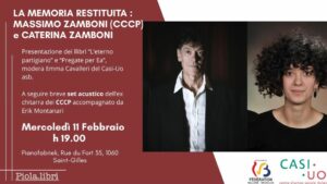 La memoria restituita: Massimo e Caterina Zamboni presentano i loro ultimi libri Piola Libri e Casi-UO presentano Massimo Zamboni e Caterina Zamboni!Una serata speciale che unisce parole e musica: oltre all’incontro sui loro nuovi libri « L’Eterno Partigiano » e « Pregate per ea », Massimo Zamboni, storica chitarra dei CCCP, si esibirà in un breve set acustico insieme a Erik Montanari.Padre e figlia dialogano sui territori dell’Appennino, tra memorie della Resistenza e origini del Regno d’Italia, in compagnia di Emma Cavalleri moderatrice del Casi-Uo asb. I due libri presentano diversi parallelismi e aprono uno sguardo profondo sull’idea di residenza e radicamento territoriale, sul …