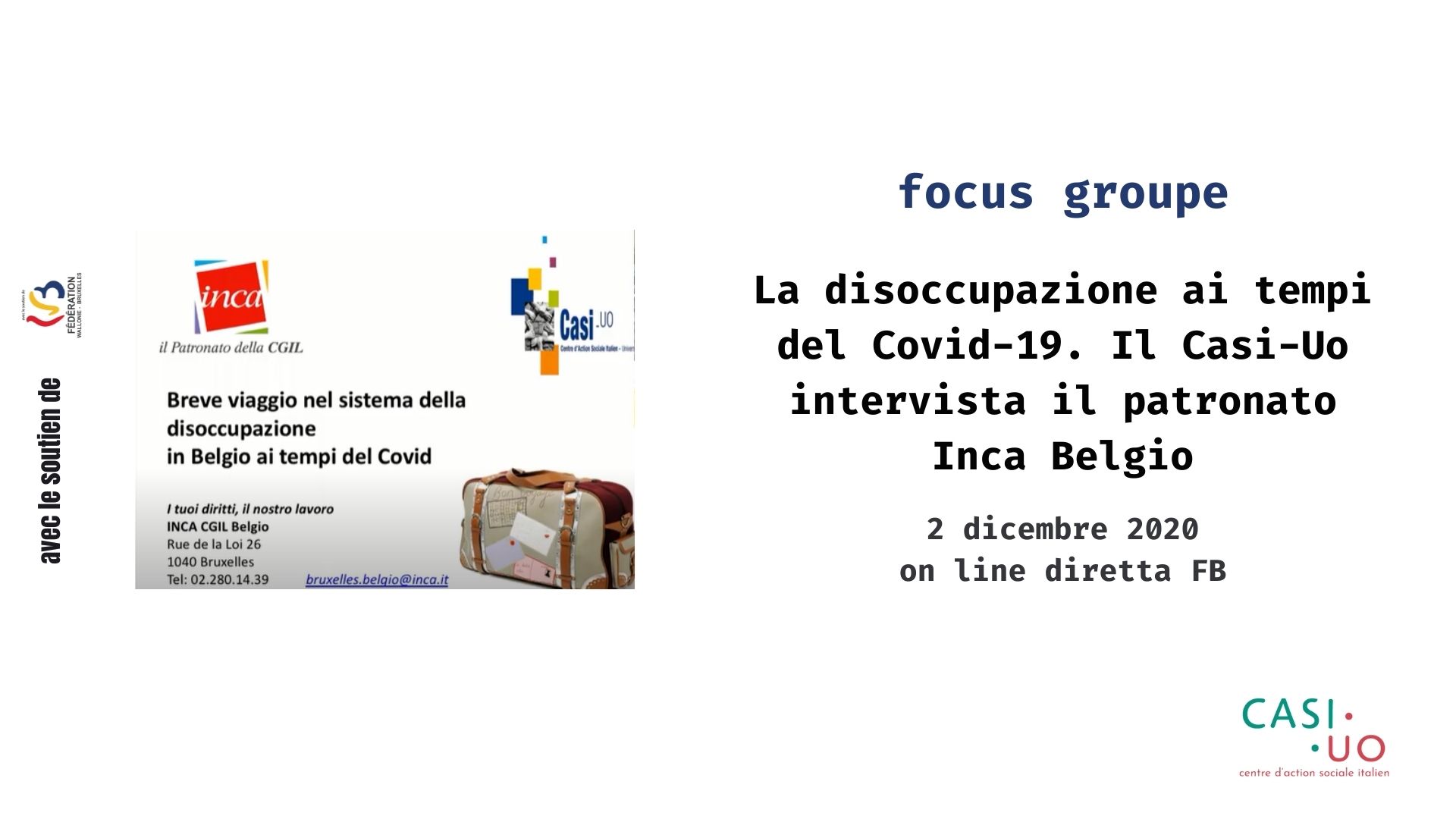 01.12.2020 – Focus groupe « La disoccupazione ai tempi del Covid-19. Il Casi-Uo intervista il patronato Inca Belgio » »